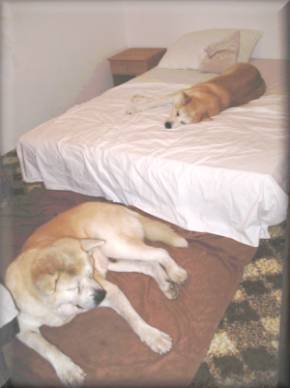 Hier bewacht Kari das Lenkrad, Bärchen okkupiert inzwischen den Kofferraum. Akitas Begeisterung lässt ihn allgegenwärtig erscheinen, irgendwann stolpert das in-zwei-Händen-drei-Koffer-schleppende-Herrchen über einen der beiden und holt sich eine ansehnliche Beule auf dem Kopf. Schluss mit dem Quatsch, Akitas ab nach Hause, Tür zu!!