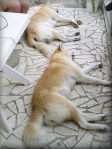 Um das zu schreiben hat mich folgende Szene animiert: Sommer im Jahr 2004, Reise im Süden Europas – Urlaubszeit. Wir sind schon seit etlichen Stunden unterwegs zu unserem Zielort am Mittelmeer, die Sonne steht hoch, höchste Zeit die nächste Pause anzulegen. Wir halten an einem kleinen, urigen und sympathischen Restaurant an und suchen uns einen Tisch im tiefen Schatten aus. Die Akitas erledigen schnell ihre dringendsten Geschäfte, schlabbern etwas Wasser aus den Näpfen und mit lauten Schnaufen legen sie sich unter dem Tisch. Dann höre ich ein paar Tische weiter halblauten Satz eines „Kenners“: „Die Huuskies verrecken ja hier!“